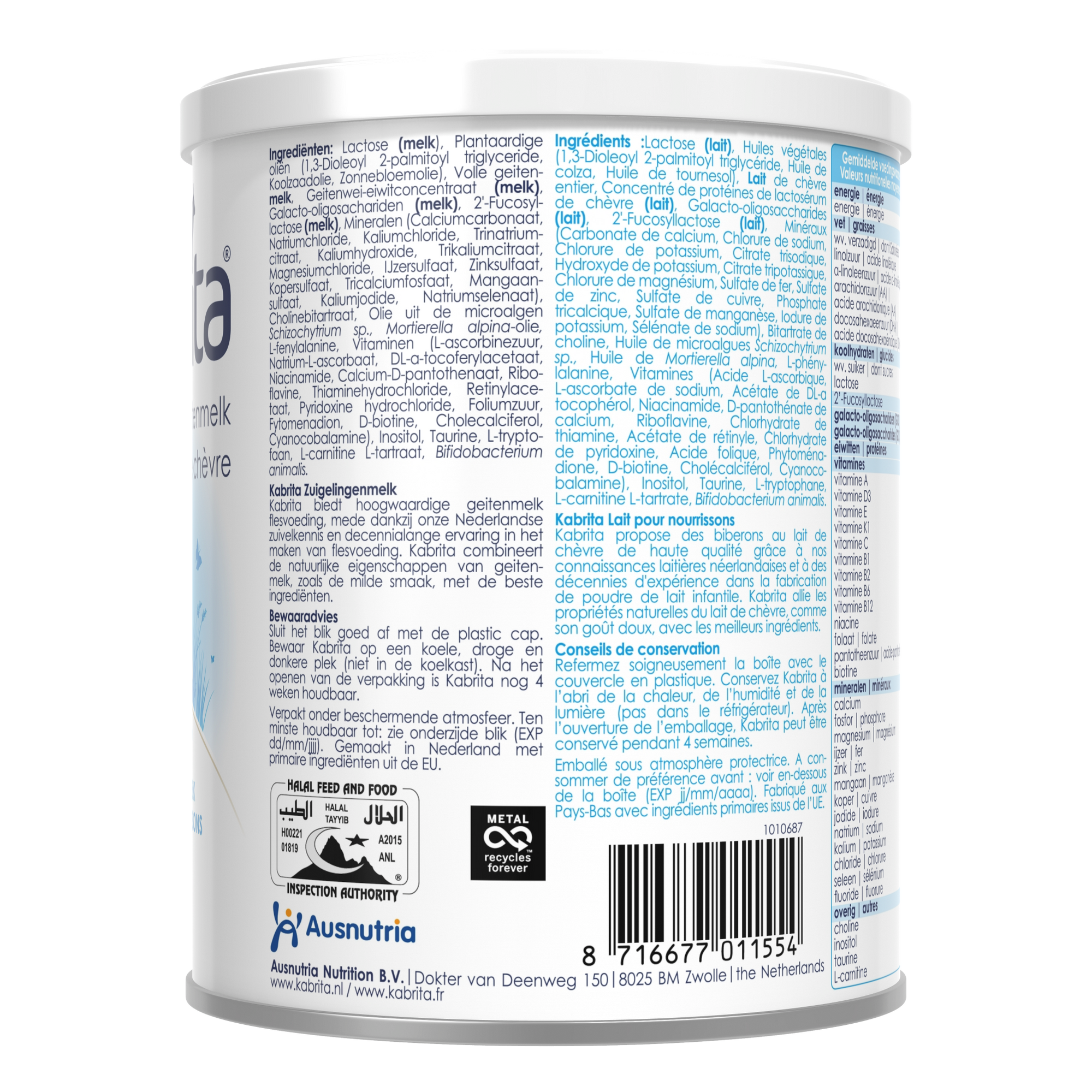 Bien fermer la boîte avec le couvercle en plastique. Conserver Kabrita dans un endroit frais et sec, à l'abri de la lumière, en dehors du réfrigérateur. Kabrita se conserve 4 semaines après ouverture de l'emballage.