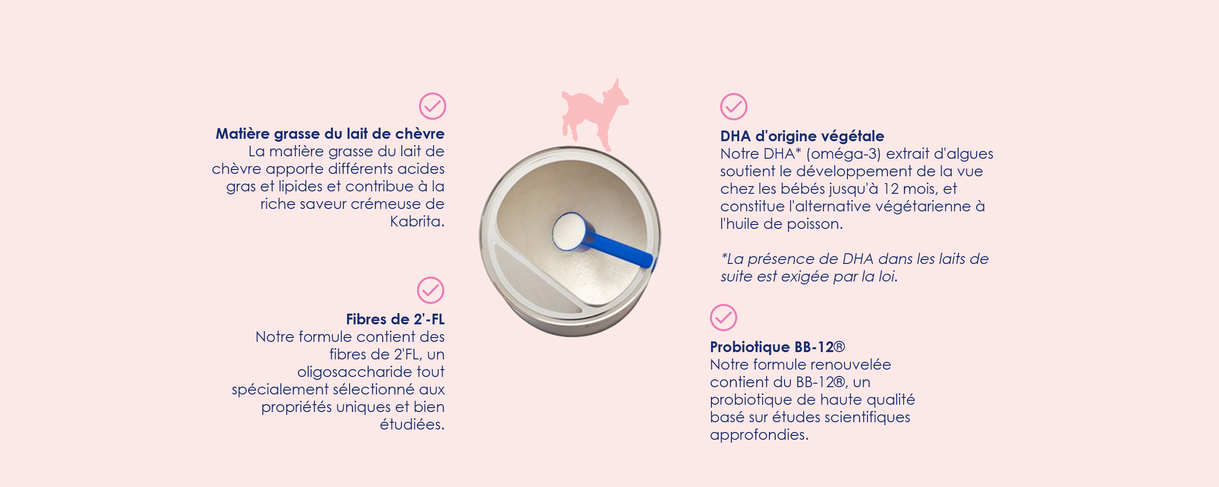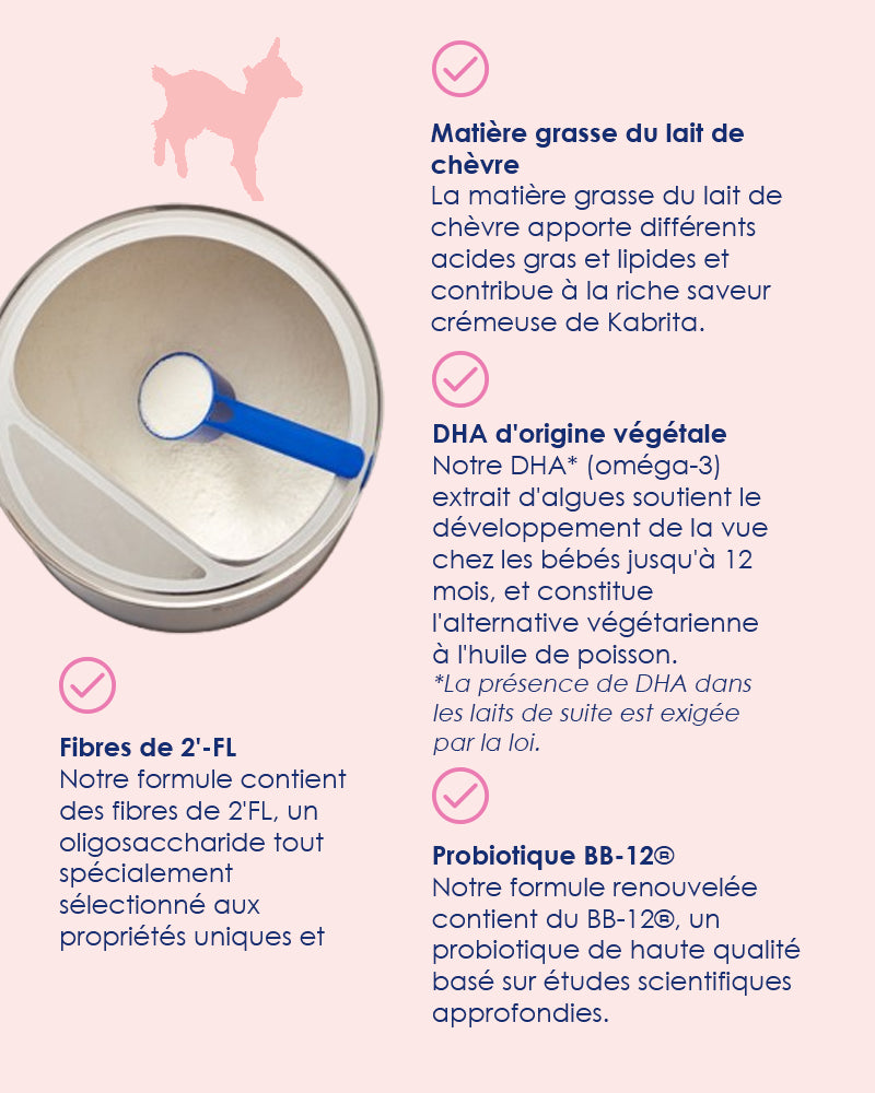 Le lait maternel est le meilleur aliment pour votre bébé. Pour la santé de votre bébé, il est important de suivre méticuleusement les instructions de préparation mentionnées sur la boîte. Kabrita Lait de suite (6-12 mois) ne peut être utilisé comme substitut du lait maternel pendent les 6 premiers mois de la vie. Kabrita Lait de suite convient pour les bébés âgés de plus de 6 mois, et doit être consommé en complément d’une alimentation variée. Composez une alimentation saine pour votre bébé en concertation avec votre médecin.