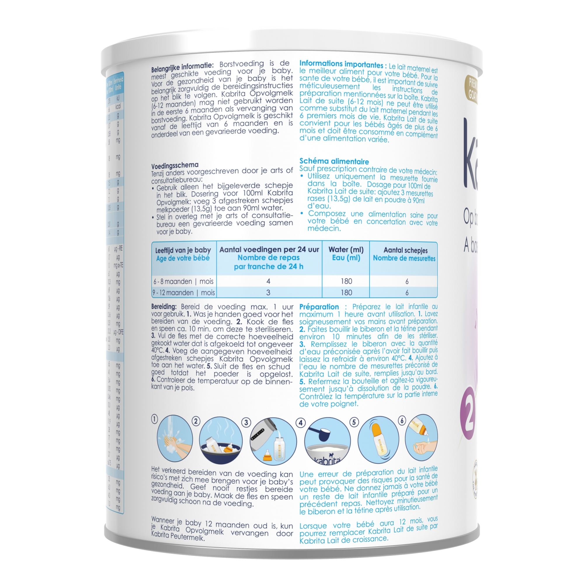 Le lait maternel est le meilleur aliment pour votre bébé. Pour la santé de votre bébé, il est important de suivre méticuleusement les instructions de préparation mentionnées sur la boîte. Kabrita Lait de suite (6-12 mois) ne peut être utilisé comme substitut du lait maternel pendent les 6 premiers mois de la vie. Kabrita Lait de suite convient pour les bébés âgés de plus de 6 mois, et doit être consommé en complément d’une alimentation variée. Composez une alimentation saine pour votre bébé en concertation avec votre médecin.
