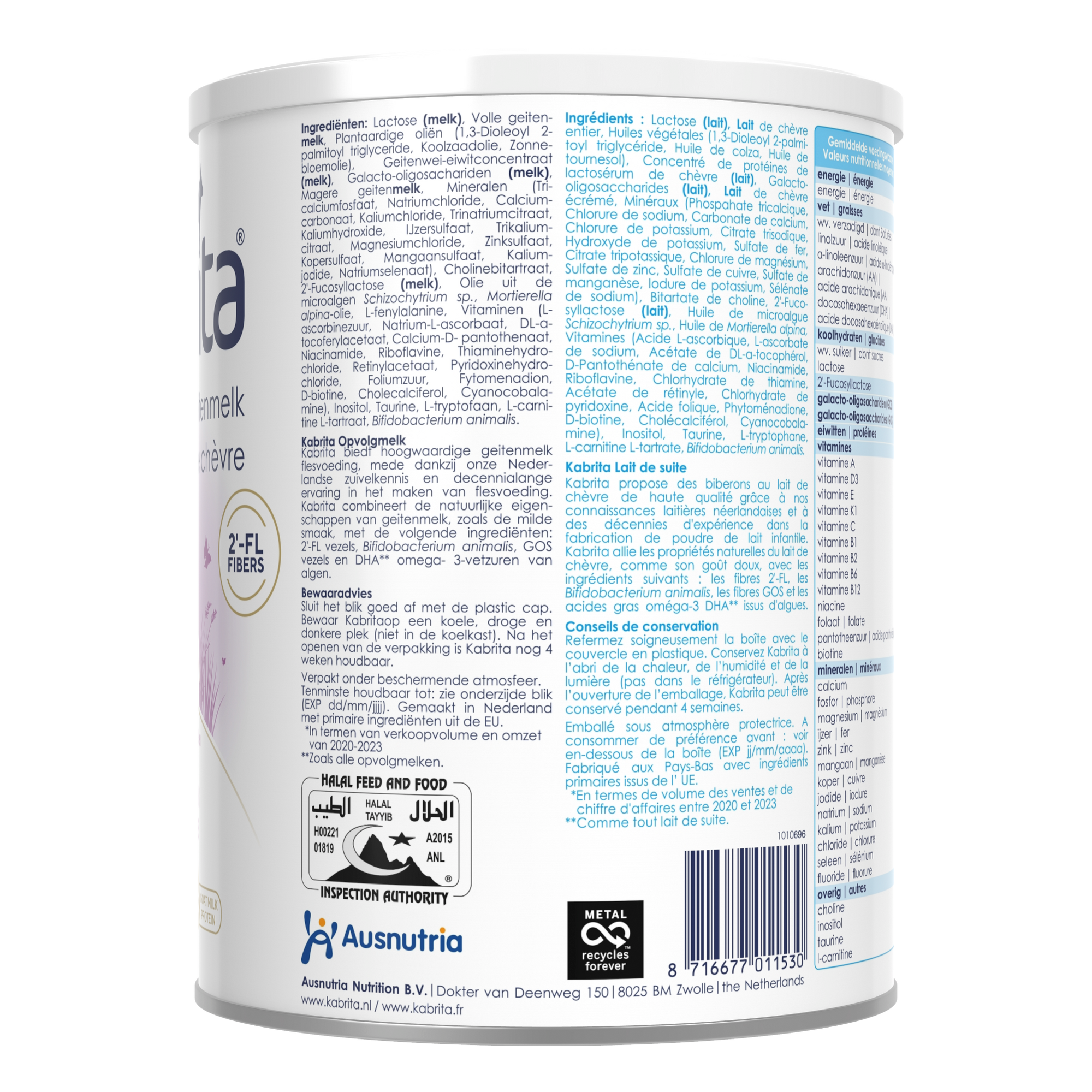 Lactose (lait), Lait de chèvre entier, Huiles végétales (1,3-Dioleoyl 2-palmitoyl triglycéride, Huile de colza, Huile de tournesol), Concentré de protéines de lactosérum de chèvre (lait), Galacto-oligosaccharides (lait), Lait de chèvre écrémé, Minéraux (Phosphate tricalcique, Chlorure de sodium, Carbonate de calcium, Chlorure de potassium, Citrate trisodique, Hydroxyde de potassium, Sulfate de fer, Citrate tripotassique, Chlorure de magnésium, Sulfate de zinc, Sulfate de cuivre, Sulfate de manganèse, Iodure de potassium, Sélénate de sodium), Bitartrate de choline, 2’-Fucosyllactose (lait), Huile de microalgue Schizochytrium sp., Huile de Mortierella alpina, Vitamines (Acide L-ascorbique, L-ascorbate de sodium, Acétate de DL-α-tocophérol, D-Pantothénate de calcium, Niacinamide, Riboflavine, Chlorhydrate de thiamine, Acétate de rétinyle, Chlorhydrate de pyridoxine, Acide folique, Phytoménadione, D-biotine, Cholécalciférol, Cyanocobalamine), Inositol, Taurine, L-tryptophane, L-carnitine L-tartrate, Bifidobacterium animalis.